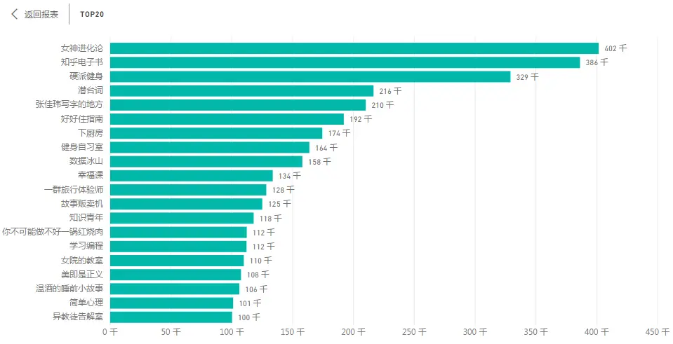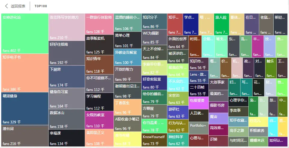 粉丝数排名TOP100专栏的门槛为40814人(“如何认真地活着”)。TOP100专栏总计8261681人次关注,占全部11088个专栏总关注31262218人次的26.4%,而TOP27专栏的关注人次占到TOP100的一半。