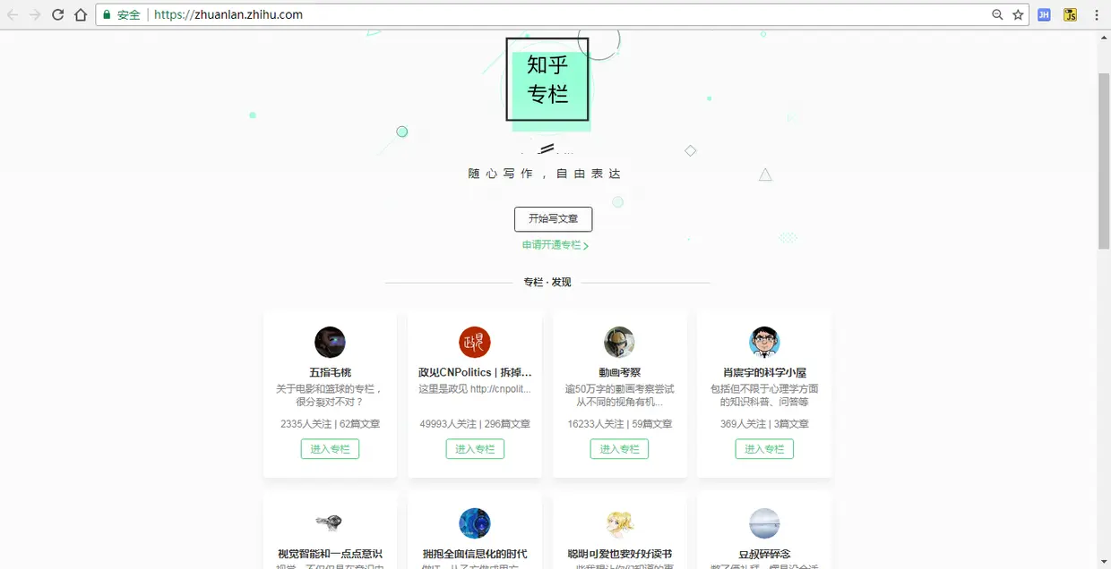 原先一直以为知乎有搜索专栏的地方,找了半天发现下面的网页后,以为捡到宝了,立马写个爬虫,翻页10000次,美滋滋地等着拿数据,却发现最后到手的有效专栏数才313个,用《红楼梦》的话说,这个网站“原来苗而不秀,是个银样镴枪头”,是个中看不中用的主。
