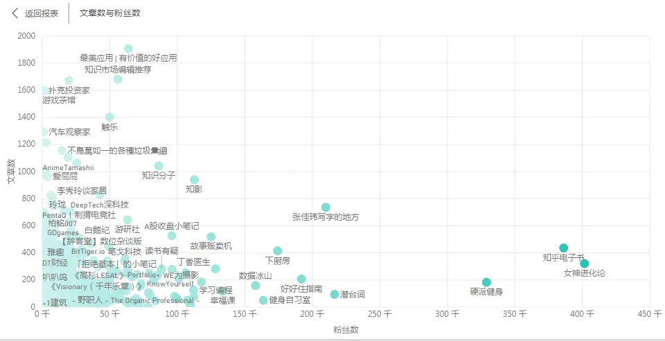 所有专栏的文章数与粉丝数情况如下,粉丝数30万+的第一梯度有:女神进化论、知乎电子书、硬派健身;20万+的有:张佳玮写字的地方、潜台词。文章数1500+的有:最美应用 | 有价值的好应用、知识市场编辑推荐、扑克投资家、游戏茶馆。