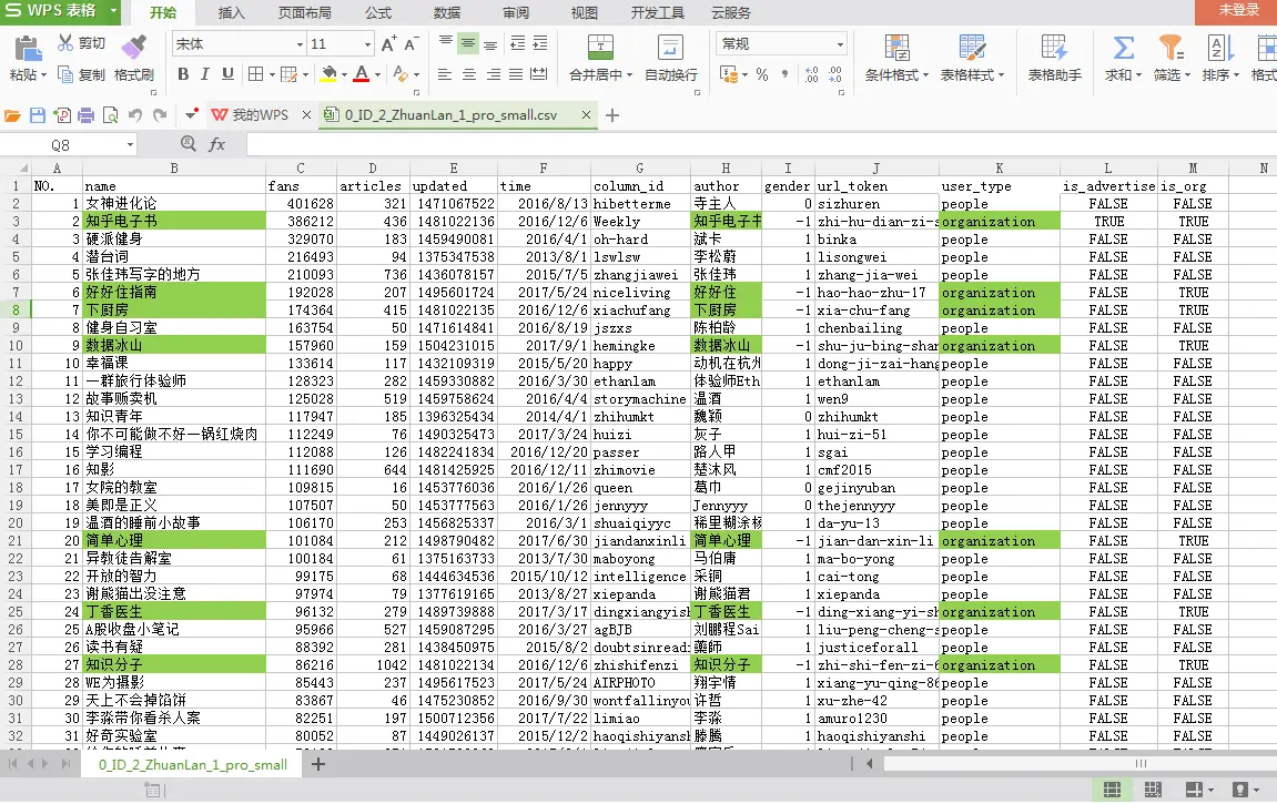 最终得到11088条知乎专栏数据,格式如下,作者为机构号的专栏特别标注出来: