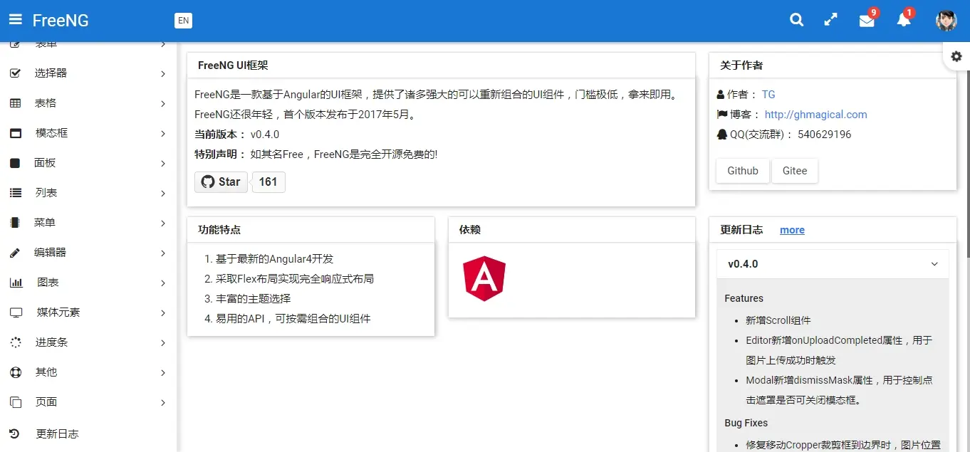 为Angular 4开发的UI组件库:FreeNG 铁锅 2017-10-21 2,136 阅读1分钟 简介 FreeNG是一款基于Angular 4的UI框架,提供了诸多强大的可以重新组合的UI组件,可以让你在项目开发中以搭积木的方式来快速高效的实现业务需求。 在线预览 在线预览 版本说明 FreeNG最新版本为v0.4.0,其中包含了按钮、表单、选择器、表格、模态框、编辑器、图表、自定义滚动条等40多种组件,未来还会不断完善和添加更多实用功能。 使用指南 FreeNG官网提供了完善的中文文档及代码示例,以便快速查阅应用。 官网 Github Github传送门