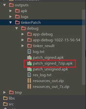 这里还没有完结,接下来我们需要使用命令行去生成 gradle tinkerPatchDebug 生成 X1包(补丁包),编译完成后会生成红色方框标记的的补丁包了,我们需要把他复制出来,名字修改成我们在TinkerInstaller.onReceiveUpgradePatch方法中设置的文件名(test)