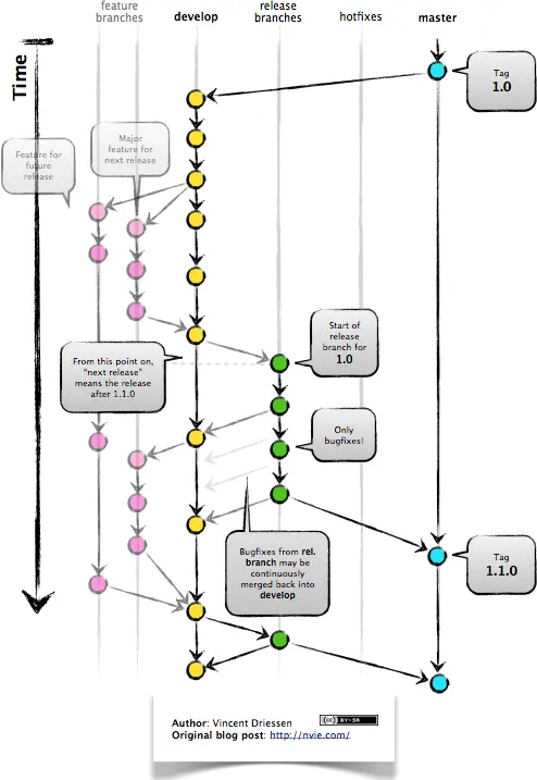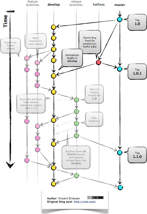 - 对于 feature 流程,都是从 develop 分支发起,然后通过 PR/MR 的方式合并回 develop 分支;
