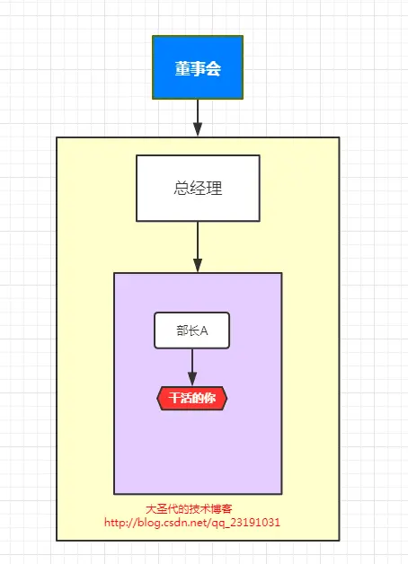 首先,请想象一下生活中非常常见的场景:假设你所在的公司,又一个总经理,级别最高,他下面有一个部长,级别次之;最低层,就是干活的你,没有级别(手下无人)。现在董事会交给总经理一项任务,总监理将这个任务部署给了部长,部长又把任务安排给了你。