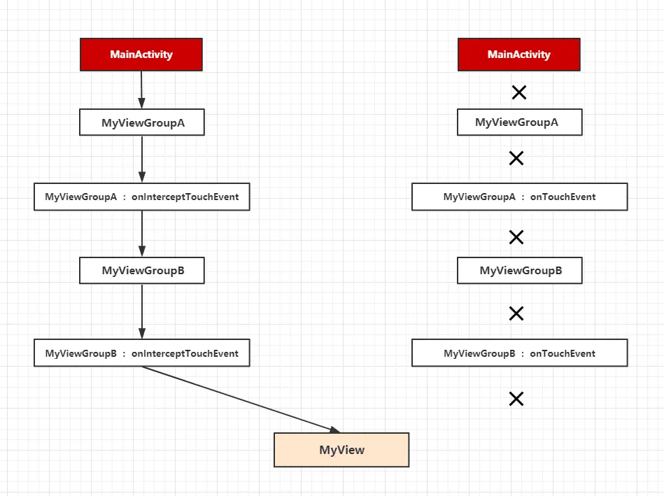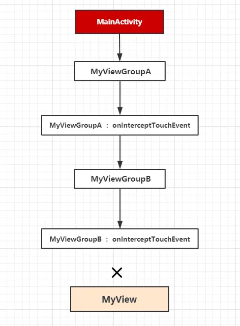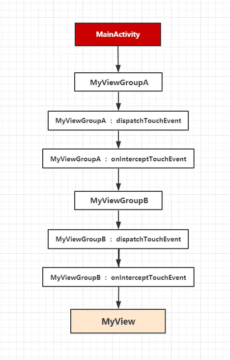 值得注意的是在事件开发工作中,虽然 dispatchTouchEvent是第一步但是我们很少会改写它,所以下面的场景中我们只关心onInterceptTouchEvent即可