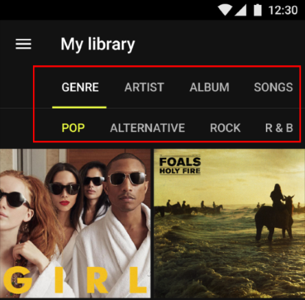 - 让未选中的tab可见。如果没被选中的tab完全在屏幕外,可能永远都不会被点。勉强可使用 Scrollable tabs ,但也不大好,还得滚动。