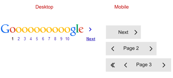 - 移动设备上可选的分页方式。移动设备空间宝贵,不可能列出一串页面,只能提供必要关键元素:当前页面数字 & 基本导航(第一页、前一页、下一页)
