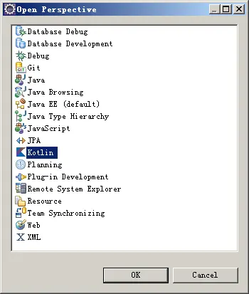 为Eclipse成功安装Kotlin插件之后,接下来即可通过Eclipse的“Window→Perspective→Open Perspective → Other...”来打开Kotlin的Perspective,如图1.9所示。