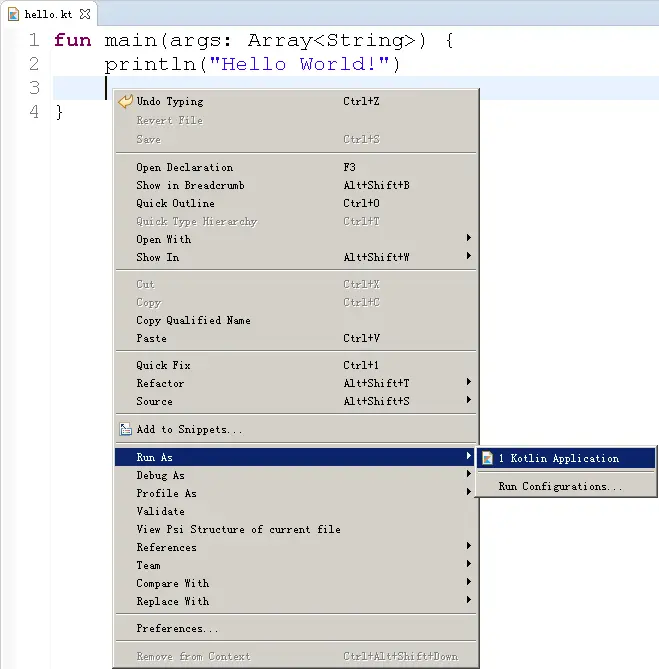 提示:使用Eclipse运行Java程序与运行Kotlin程序并没有什么区别。为Eclipse安装了Kotlin插件之后,Eclipse就知道使用kotlinc编译器来编译Kotlin程序,而且Eclipse也会该项目添加了Kotlin的运行时环境库,这样即可运行Kotlin程序了。
