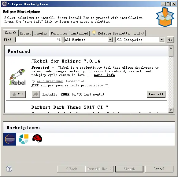 (1)单击Eclipse主菜单中“Help”菜单,然后单击“Eclipse Marketplace”菜单项即可看到Eclipse弹出如图1.7所示的插件安装界面。