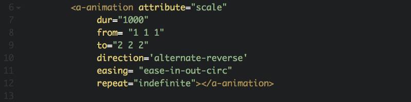 现在,我们创建一个新的<a-animation>标签并修改其参数,设置属性