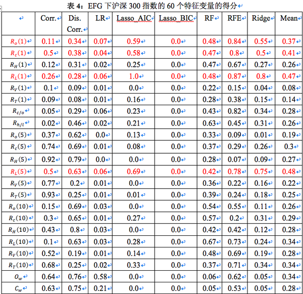 表4 为沪深300指数的 60 个特征变量的在 EFG 得分。值得注意的是,基于 BIC 的 Lasso 回归对所有的特征变量均给出了 0 分。其原因是是在 2647 个观测值的情况下,BIC 表达式中的惩罚项权重较高,我们选用的特征变量均未被认为能显著改善回归结果。红色部分为得分均值高于 0.35,用于聚类分析的特征变量。