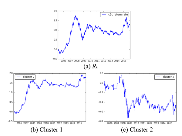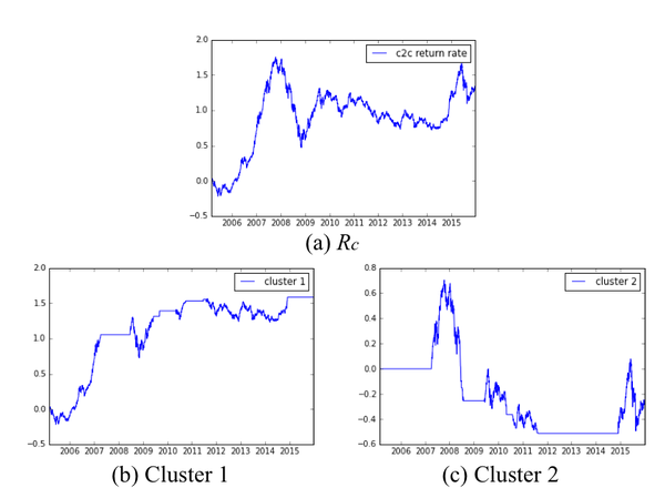 图4:使用EFG进行特征选择后累积收益率曲线计算:(a)沪深300指数;(b) 在聚类1包含的交易日进行交易;(c) 在聚类2包含的交易日进行交易