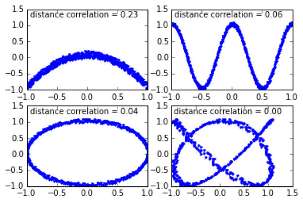 图2:不同的非线性相关下,两个变量的距离相关系数