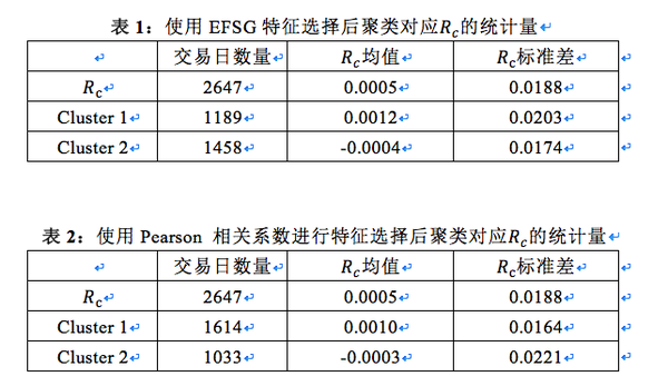 在EFG测试中,我们以得分高于0.35为标准,选取了14个特征变量进行聚类分析(附录3)。依照上一篇研究报告的分析方法,我们计算了两个聚类对应的均值和标准差(表1),并和上一篇报告的结果进行了对比(表2)。结果表明两个聚类的均值差值增加,聚类区分度提高,且聚类1的标准差增加的同时聚类2的标准差减少,说明一部分波动率较大的交易日被归为聚类1。
