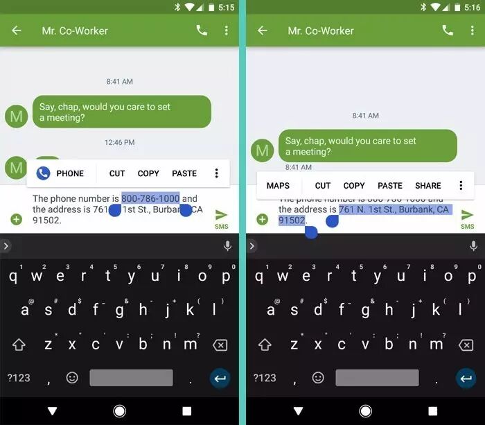 在支持它的应用程序中,您可以在任何地方轻按地址,URL,电话号码或电子邮件地址。Android 会识别文本的内容,并快速为您选择整个字符串,自己找出适当的开始和结束点,然后将为您提供一键选择,选择最合乎逻辑的位置(例如,带有号码的新电话或地址)。