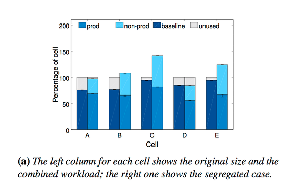 在了解这么多Borg的系统概念之后,我们来看看具体用Borg的效果如何。Paper里面也提到了其它公司batch job跟prod是分开的,这个paper也看了一下如果batch job是分开跑的话Google需要多出多少钱: