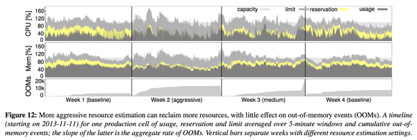- resource reclaimation:虽然程序要求一定的资源,Borg通过自己的判断去降低这个要求,比如可以拿更多的OOM来换取更极限的叠加。效果如下图