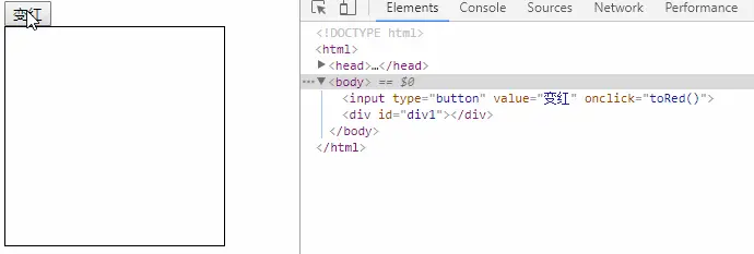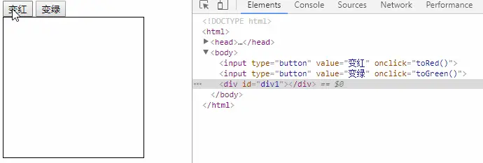 这段代码的作用不必多说,点击变红按钮后,div1块的背景颜色会变为红色。现在我们打开浏览器的控制台(F12),选中Div1,观察点击前后的变化: