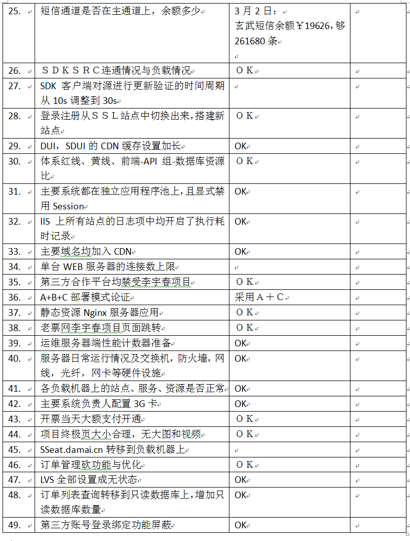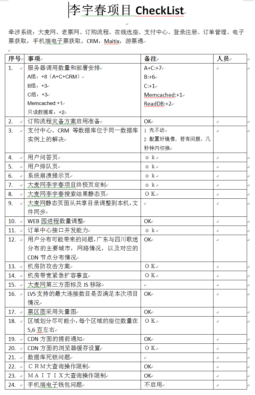 从2009年起经历了很多大型项目的抢票,什么样的情况都经历过(譬如服务器松了个水晶头、机房出口带宽被流量怼死了服务器集体全部失联、正抢着票呢办公室突然断网等等许多人这辈子都碰不上的情况),总结了很多的经验,形成CheckList。每当有新热门项目时就拿出CheckList逐项检查看各项工作是否做到位。每场抢票活动结束后仔细总结,再往CheckList上补上几条。