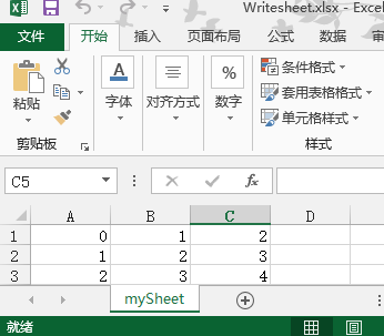 上面的程序中创建了名字为mySheet的电子表格,写了三行三列的数据,POI中使用XSSFRow对象表示行对象,使用XSSFRow row = sheet.createRow(r);创建一个行对象,参数是行号,Cell表示一个单元格对象,可以使用行对象XSSFRow创建一个单元格格对象,Cell cell = row.createCell(c);参数是列号。