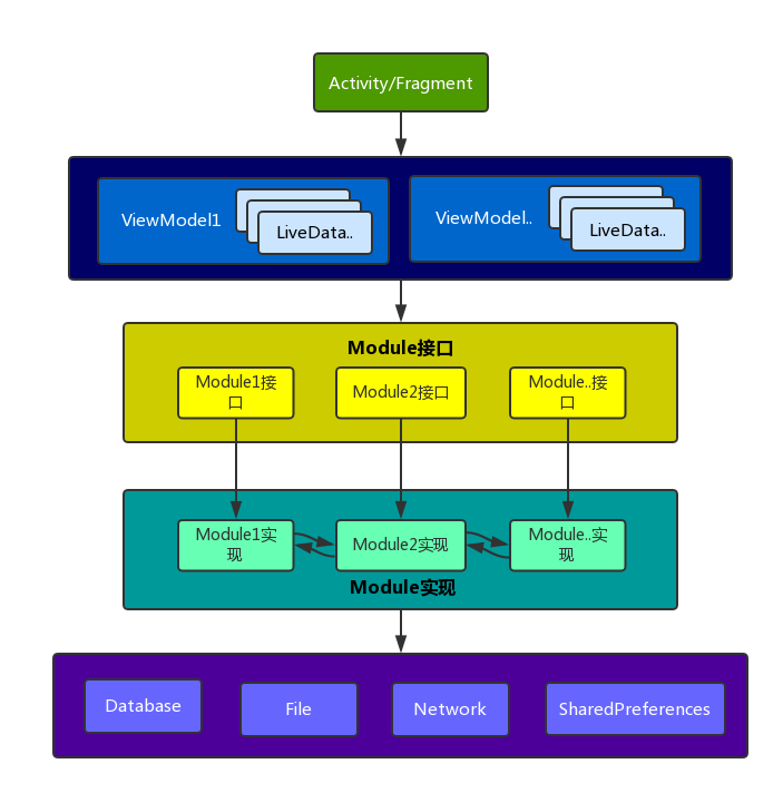 这张图Model层的实现细化了许多。Model是个容易混淆的词,可等同与JavaBean,Entity等实体类,亦可指广义上的数据层,本文改用Module代指后者。不同的业务模块归类到不同的Module类,如用户模块UserModule,直播模块LiveModule。那Mudule该如何封装方法给ViewModel调用?。地球人都知道UI线程不可做耗时操作。这样Module提供的方法分两种:非耗时和耗时。