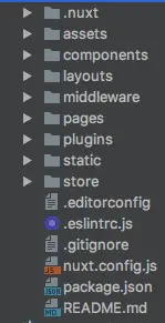 完成了一个简单的 Hello World 项目后,我们来进一步研究 Nuxt.js。进入 Nuxt.js 项目后,项目目录如下: