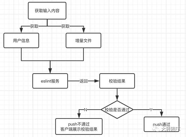 钩子选择好了,接下来就是怎么做了,下面是一个简单的流程图,具体为从标准输入中获取三个值,分别是推送前的引用指向内容的SHA-1值,用户准备推送内容的SHA-1值和分支名,我再代码里分别用变量oldhash,newhash和branch来表示这三个值,下面有用到。根据这三个值用git命令分别获取用户信息和提交的增量文件,把这些文件推送到eslint服务上进行代码校验,校验成功就直接push通过;不成功则在客户端返回校验结果,push不通过。