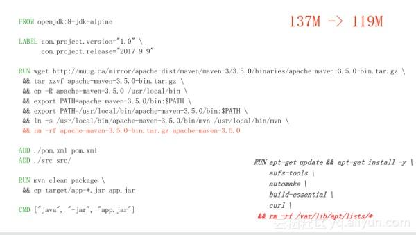 我们可以减少镜像的层数, Docker对于Docker镜像的层数是有一定要求的,除掉最上面在容器运行时候的读写层以外,我们一个镜像最多只能有127层,如果超过可能会出现问题,所以第二行命令LABLE就可以把它合成一层,减少了层数,下面六个RUN命令做了maven的安装工作,我们也可以把它做成一层,把这些命令串起来,后面的构建我们也可以把它合成一层,这样我们一下就把镜像层数从14层减少到7层,减掉了一半。