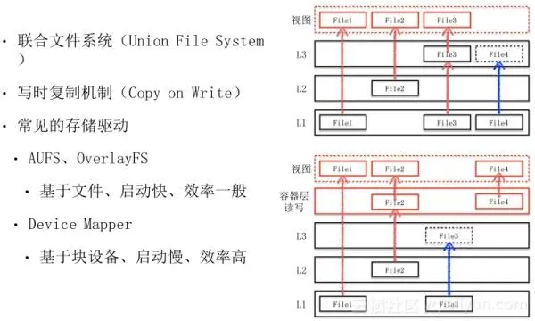 Docker镜像是存在联合文件系统的,每一个镜像其实是分层存储的,比如在第一层我们添加了三个新文件,然后在这一层基础上我们又增加了一层,添加了一个文件,第三层可能会需要做一些修改,我们把File3做了一个修改移到上面来,然后删掉了File4,这里就会引到联合文件系统里面的写时复制机制,当我们要去修改一个文件的时候,镜像依赖底层都是只读的,我们不能去直接修改,比如我们想去修改File3,我们不能直接去修改这个文件,我们需要在修改的时候把文件复制到当前这一层,比如说L3层,然后再去修改它。