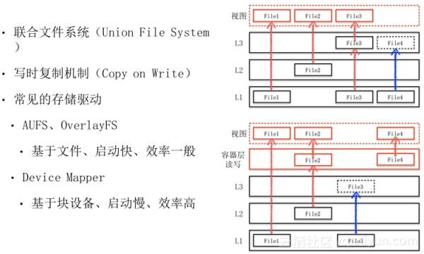 常见的存储驱动主要有AUFS、OverlayFS,还有Device Mapper,前两种驱动都是基于文件,它的原理就是需要修改一个文件的时候把整个文件复制上去做修改, Device Mapper更偏底层一点,它是基于块设备的,它的好处在于当我想要修改一个文件的时候,我不会将整个文件拷上去,我会将文件修改的一些存储块拷上去做一些修改,当我有一些大文件想要修改的时候,Device Mapper会比AUFS、OverlayFS好很多。所以AUFS和OverlayFS就比较适合传统的WEB应用,它的文件操作不会很多,但是它可能对我们的应用启动速度会有一些要求,比如我可能经常要发布,我希望能够启动比较快,但是对于文件修改的一些效率我不是很关心,那可以使用基于文件的驱动,当我们是一些计算密集型的应用时候,我们就可以选择Device Mapper,虽然启动比较慢,但是它的运行效率相对表现要好一些。