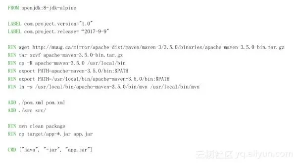 我们构建一个镜像的时候,Docker其实提供了一个标准化的构建指令集,当我们去用这些构建指令去写类似于脚本,这种脚本我们称之为DockerFile,Docker可以自动解析DockerFile,并将其构建成一个镜像,所以你就可以简单的认为这是一个标准化的脚本。DockerFile在做一些什么?首先第一行FROM指令表示要以哪一个镜像作为基础镜像进行构建,我们用了openJDK的官方镜像,以JAVA环境作为基础,我们在镜像上面准备跑一个JAVA应用,然后接下来两条LABLE是对镜像进行打标,标下镜像版本和构建日期,然后接下来的六个RUN是做了一个maven安装,maven是JAVA的一个生命周期管理工具,接下来将一些源代码从外面的环境添加到镜像里面,然后两条RUN命令做了打包工作,最后写了一个启动命令。