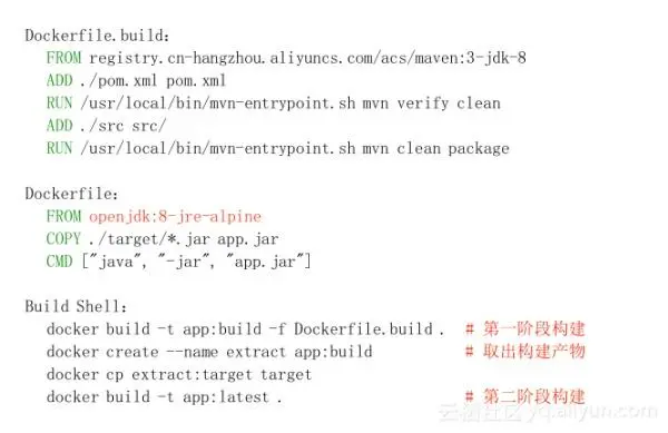 DockerFile最终需要做到的产物其实是JAVA应用,我们对于构建、编译、打包或者安装这些事情都不关心,我们要的其实是最后的产物。所以,我们可以采取分步的方式去做镜像构建,首先我们将之前遇到的所有问题全部都做成基础镜像,上面FROM镜像其实已经改了新的,镜像里面已经把软件源的地址改成了Maven,缓存都已经做好了。我们会去利用缓存,然后添加源代码,我们把前面构建的事情做成了镜像,让镜像去完成构建,然后我们才会去完成把JAVA包拷进去,启动工作,但是两个DockerFile其实是两个镜像,所以我们需要一段脚本去辅助它,第一行的shell脚本是做第一个构建指令,我们指定以Bulid的DockerFile去启动构建,然后生成一个APP Bulid镜像,接下来两行脚本是把镜像生成出来,把里面的构建产物拷出来,然后我们再去做构建,最后把我们需要的JAVA应用给构建出来,这样我们的DockerFile相比之前就更加清晰了,而且分步很简单。