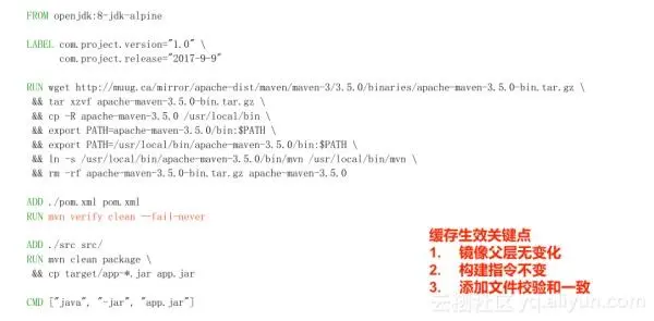 我们可以利用构建的缓存,Docker构建默认会开启缓存,缓存生效有三个关键点,镜像父层没有发生变化,构建指令不变,添加文件校验和一致。只要一个构建指令满足这三个条件,这一层镜像构建就不会再执行,它会直接利用之前构建的结果,根据构建缓存特性我们可以加一行RUN,这里是以JAVA应用为例,一般一个JAVA应用的pom文件都是描述JAVA的一些依赖,而在我们平常的开发过程中这些依赖包发生变化的频率比较低,那么我们就可以把POM加进来,把POM文件依赖全部都准备好,然后再去下源代码,再去做构建工作,只要我们没有把缓存关掉,我们每次构建的时候就不需要重新下安装包,这样可以节省大量时间,也可以节省一些网络流量。