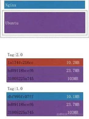 镜像是什么?从一个比较具体的角度去看,镜像就是一个多层存储的文件,相较于普通的ISO系统镜像来说,分层存储会带来两个优点,一个是分层存储的镜像比较容易扩展,比如我们可以基于一个Ubuntu镜像去构建我们的Nginx镜像,这样我们只需要在Ubuntu镜像的基础上面做一些Nginx的安装配置工作,一个Nginx镜像工作就算制作完成了,我们不需要从头开始去制作各种镜像。另一点我们可以优化镜像存储空间,假如我们有两个镜像,Tag1.0镜像和 Tag2.0镜像,我们如果以传统方式去传这两个镜像,每个镜像大概130多兆,但如果我们以分层的方式去存储两个镜像,我们通过下面两个紫色的才能共享,可以节约大量的空间,两个镜像加起来只需要140多兆的空间就可以存下来。这样一是节省了存储空间,二是可以减少网络上的开销,比如我们已经把下面镜像下载了,我们要去下载上面镜像的时候,我们只需要去下10M的部分。