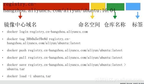 我们的一个镜像会有一个坐标,一个镜像坐标基本上会由四个部分组成,前面会有一个镜像服务域名,每一个服务提供商都会有不同的域名,当我们确定服务提供商给我们的域名之后,我们一般会要到服务提供商那里去申请自己的命名空间,仓库名称一般是标识镜像的用途,比如说Ubuntu镜像、CentOS镜像,标签一般是用于去区分镜像版本,比如我们对Ubuntu镜像可能会打一些16.04的包,在我们确定了一个镜像服务域名以及在云服务商申请命名空间之后,我们就可以对镜像做一些操作了。