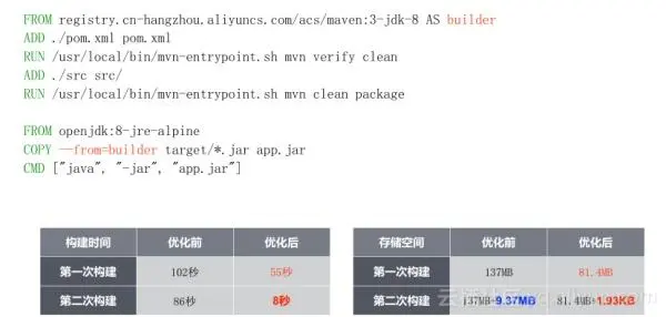 Docker在17.05之后官方支持了多阶段构建,我们把下面的脚本去掉了,我们不需要一段辅助脚本,我们只需要在后面申明基础镜像的地方标记,我们第一阶段的构建产物名字叫什么,我们就可以在第二个构建阶段里面用第一个构建阶段的产物。比如我们第一阶段把JAVA应用构建好,把Maven包里面的target下面的JAVA架包拷到新的镜像里面,然后在所有优化做完之后效果如图,我们在第一次构建的时候,优化前102秒,在Docker构建优化后只花55秒就完成了,主要优化在网络上面。当我们修改了JAVA文件重新进行构建,第二次构建花了86秒,因为Maven安装那一块被缓存了,我们利用了构建缓存,所以少掉20多秒,优化后只花了8秒,因为所有的源代码前面的一些软件包下载全部被缓存了,我们直接拉新的镜像,然后依赖没有变,直接进行构建,所以8秒基本上是完整构建时间。