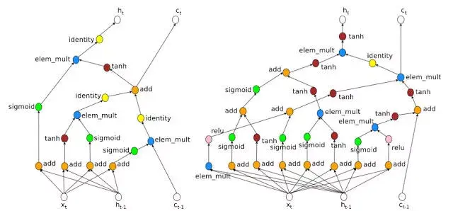 下图的两个模型是基于 Penn Treebank 数据集设计的预测模型,其中左边是人类专家设计的,右边则是 AutoML 设计的。