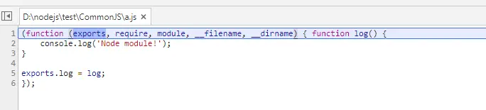 在浏览器里我们看到了这样的一幕,很奇怪是不是,我们明明没有写这么多代码。原来Nodejs悄悄地帮我们做了这项工作,在我们代码的头和尾加上了这些代码。我们再来看一看,函数里面传入的几个参数是什么?里面的require就不用多说了,这是用来引入的,而 __filename 和 __ dirname顾名思义就是指这个模块的文件路径和文件夹路径,下面我们就来看一看exports和module.exports。