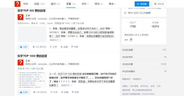 接着由于知乎官方没有搜索专栏的渠道,于是根据上述30多万ID,爬取各自主页关注的专栏,拿到11088条专栏数据,《爬取11088个知乎专栏,打破发现壁垒》;