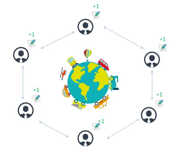 这就意味着,以前由一个中心化的机构帮你记账对账,现在由每一个网络中的参与者帮你记账,大家都有同一个账本。如下图