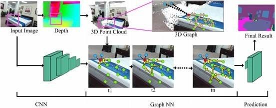 本论文与香港中文大学、多伦多大学合作完成。本论文专注解决RGBD图像的语义分割问题。与比较常见的RGB图像分割问题相比,这个问题又有了深度的信息。深度信息能够表征物体的几何形状,并且能够更精确的描述像素件的几何链接。因此如何利用深度信息做到更精确的图像分割成为这个问题最核心的模块。在此之前的方法都是先将深度图编码成HHA图像,然后再把HHA图当作另外一张图像并输入到神经网络里抽取特征。这种方法在本质上还是一个基于2D的解决思路,无法更好的融合点之间在真实空间的联系,并不能使得到的结果很好的利用深度信息。本文作者提出在把深度信息转化为点真实的三维坐标,然后建立基于点实际坐标的knn 图。并且利用基于图的神经网络,能够让图像特征可以根据knn图相互迭代更新每个点的特征。最后再利用分类网络对更新过的特征进行分类完成图像RGBD图像分割的问题。本文算法在效果上超过现在的基于2d卷积的方法,体现了该方法利用几何信息完成特征迭代更新的有效性。