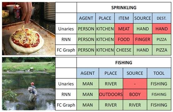 本论文与香港中文大学和多伦多大学合作完成,作者提出了一种基于图模型的神经网络用于情景识别任务。在情景识别任务中,算法需要同时识别图中所展示的动作以及参与完成这个动作的各种角色,比如主语、宾语、目标、工具等等。为了显式地对不同角色间的关系建模,文中提出的图模型神经网络将表示不同角色的节点连接在了一起,并通过信息传递的方式使得网络可以输出一个结构化的结果。作者在实验中比较了不同的连接方式,比如线形结构,树形结构和全连接结构,发现在情景识别任务中全连接结构的效果最好。最后,文中还展示网络所学习到的对于不同动作的特有的连接结构。上图所示的结果图,比较了不同模型的检测结果。其中蓝底的表示参与动作的角色,绿底表示正确的预测结果,红底表示错误的预测结果。我们可以看到,使用全连接图模型能够纠正一些由其他模型产生的错误。