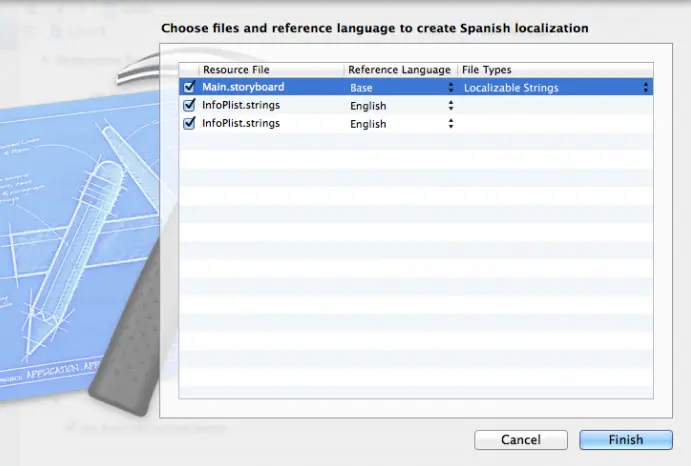 下个屏幕会询问你哪些文件需要本地化。选中所有文件并点击Finish。注意:Localizable.strings没有展示在这个列表中,不过不用惊慌!
