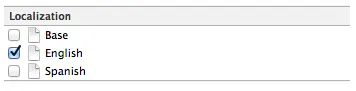 现在File Inspector面板将会展示文件所属的语言。目前,正如你所看到的,文件只针对英文进行本地化。可通过点击Spanish左边的框框添加西班牙语本地化。