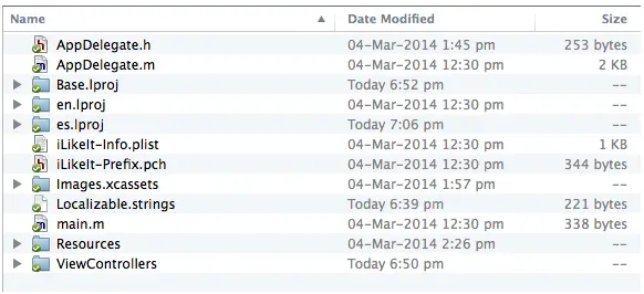 从截图中看出,你需要本地化四个项目: UI元素: Hello Label UI元素: You like? Button 销售数据文本: Yesterday you sold 1000000 apps 图片文本: I LIKE IT 花一小会儿时间浏览文件和文件夹来熟悉下项目结构。 Main.storyboard包含单个屏幕,它是ViewController类的实例。