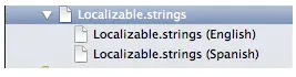 回到左窗格并点击Localizable.strings旁边的箭头,它会显示出子元素。现在文件已经有了两个版本:一个是英文本,一个是西班牙语版。