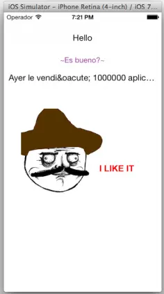恭喜!现在你的应用支持两种语言了! 为了测试和验证所有事情都正常工作,你可以在模拟器/设备上把展示语言更改为Spanish,方法是打开设置应用,然后选择:General -> International -> Language -> Espanol. 如果 Xcode debugger仍在运行中,你可以在Xcode中点击“stop”,然后点击“Build & Run”,你将会看到: