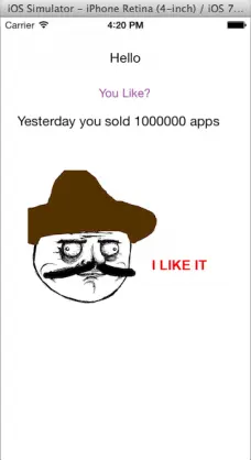 现在切换至ViewController.m,找到viewDidLoad方法,现在app会为likeButton和salesCountLabel设置文本,展示如下: