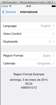这对美国人来说非常棒,但在西班牙,100万写作“1.000.000″而不是“1,000,000″。在西班牙文环境下运行应用程序,你将会看到逗号用来隔开0。在iOS中,数字格式化是基于地区/国家,而不是语言,所以为了了解某个西班牙人如何查看销售数据,可打开Settings.ap,并通过导航改变区域:General